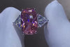 8 Carat Pink Elongated Cushion Cut Three Stone Reverse Tapered Moissanite Ring